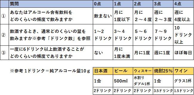 合計が女性で4点、男性で5点以上の方は危険な飲酒、またはアルコール依存症の可能性があります。